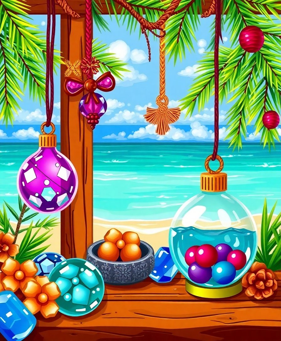 Transform your space with the enchanting beauty of coastal nostalgia through this Rustic Seaside Glass Ornaments Paint By Numbers masterpiece. This captivating artwork brings together vintage charm and tropical serenity, featuring delicate glass spheres that capture the essence of seaside memories.