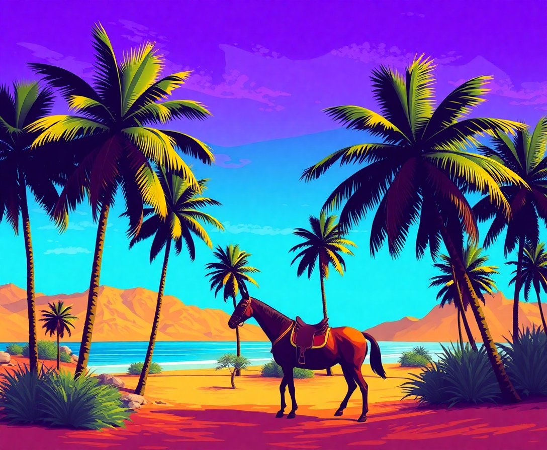 Transform your creative space with this captivating Desert Oasis Landscapes masterpiece. Furthermore, this enchanting scene captures the essence of tropical tranquility where equestrian elegance meets lush paradise.