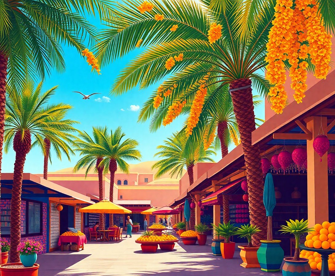 Our premium canvas features exceptional detail reproduction and color accuracy. Moreover, the high-quality acrylic paints ensure long-lasting vibrancy and professional results. The realistic portrayal of tropical architecture combined with authentic Middle Eastern market elements creates an immersive artistic experience that transports you to exotic destinations.