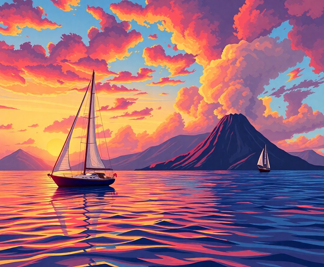 Transform your creative space with the captivating Sailing The Smoky Tropics Paint By Numbers kit. This stunning artwork captures a sailboat navigating through volcanic haze and tropical waters. Moreover, the realistic design brings island serenity directly to your home.