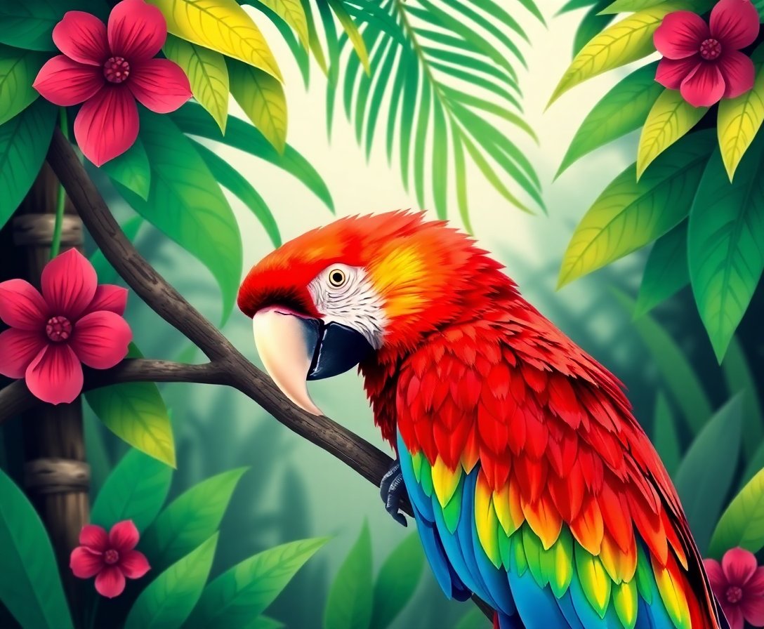 Ultimately, step back and admire your finished tropical masterpiece. Furthermore, the vibrant scarlet, blue, and yellow hues will bring jungle warmth to any room. Additionally, your completed artwork showcases impressive artistic achievement.