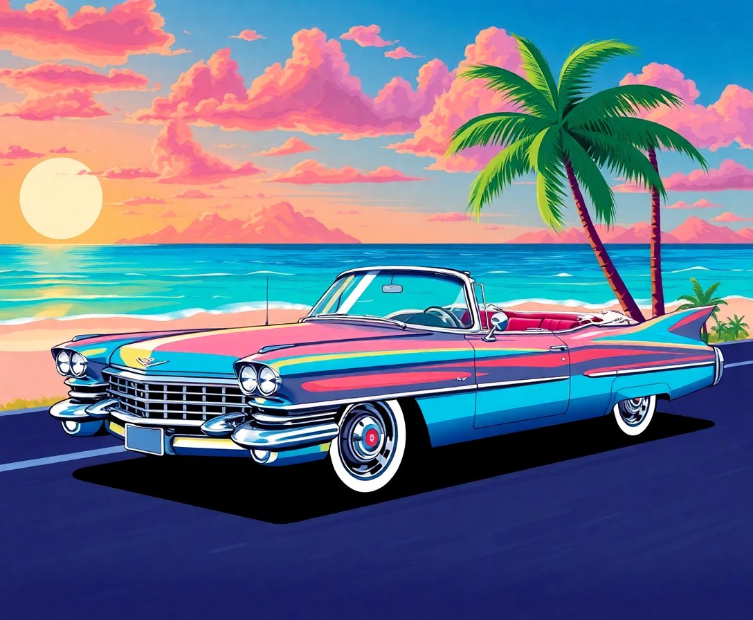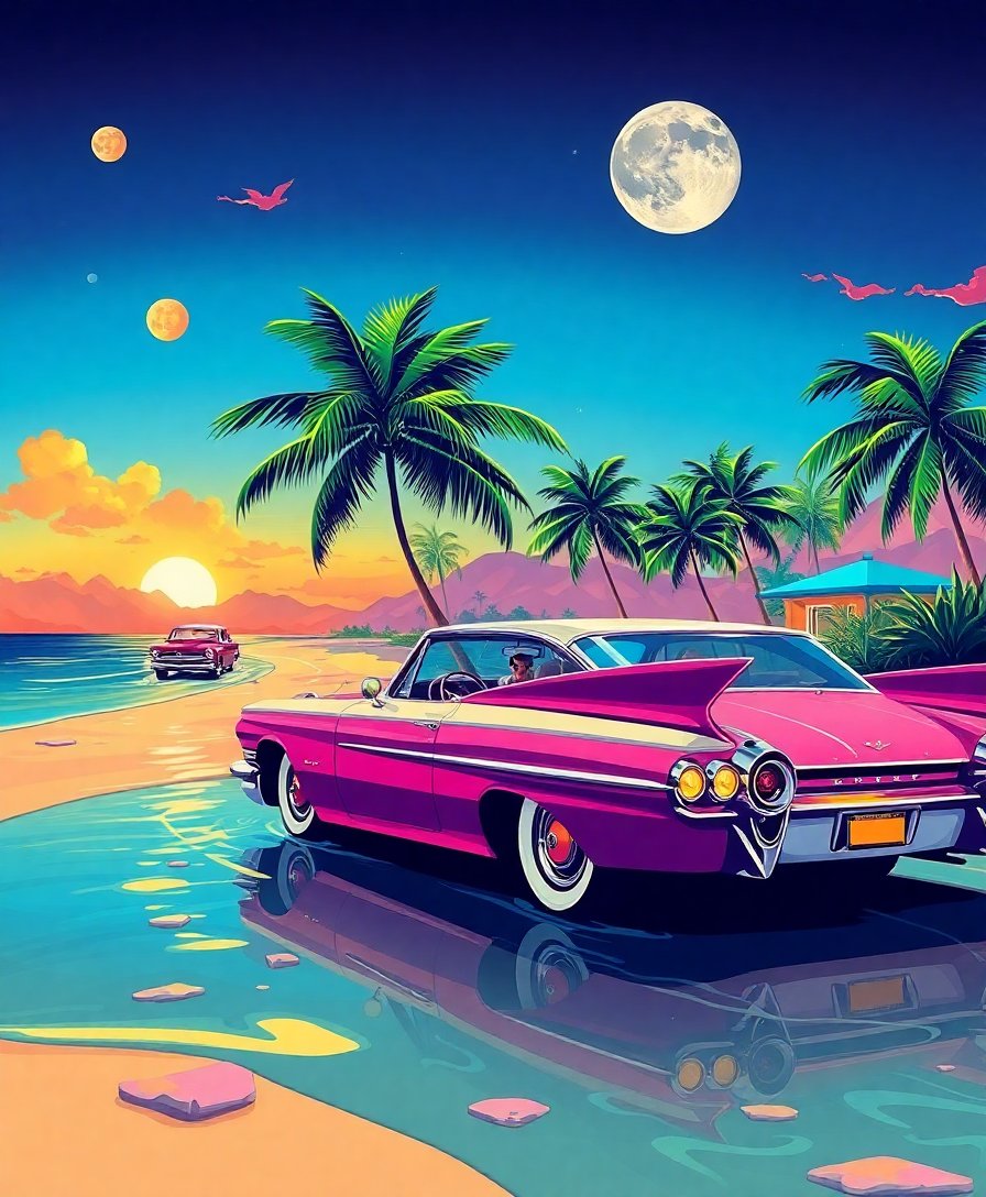 This unique artwork combines vintage Cadillac styling with extraterrestrial elements and vibrant tropical colors. The mid-century aesthetic creates a perfect blend of nostalgia and imagination.