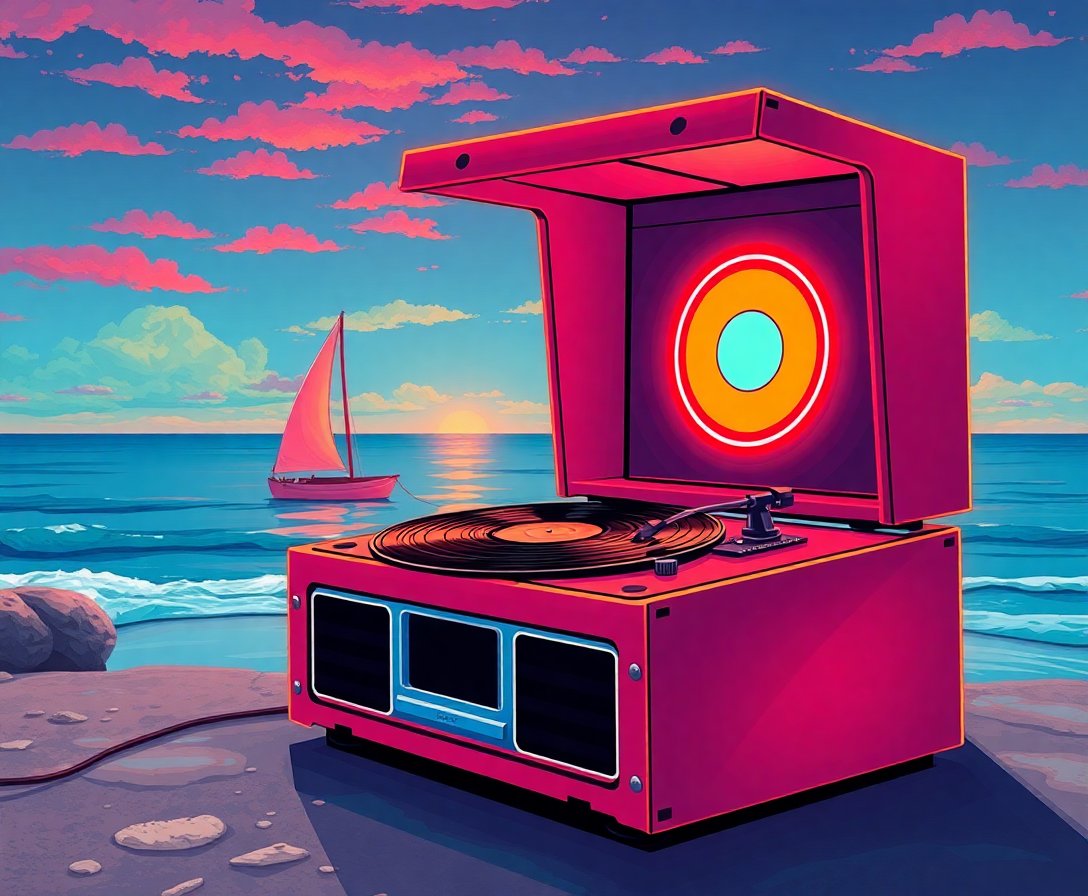 Transform your creative space with this captivating Seaside Neon Vinyl Player Paint By Numbers design. This unique kit brings together vintage charm and tropical vibes. Watch as neon colors illuminate your canvas with retro brilliance.
