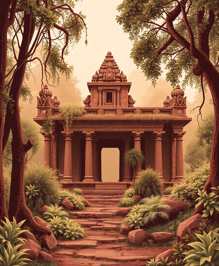 The vintage sepia palette creates timeless elegance with warm, nostalgic tones. This color scheme adds sophisticated charm to any room while evoking ancient temple mysteries.