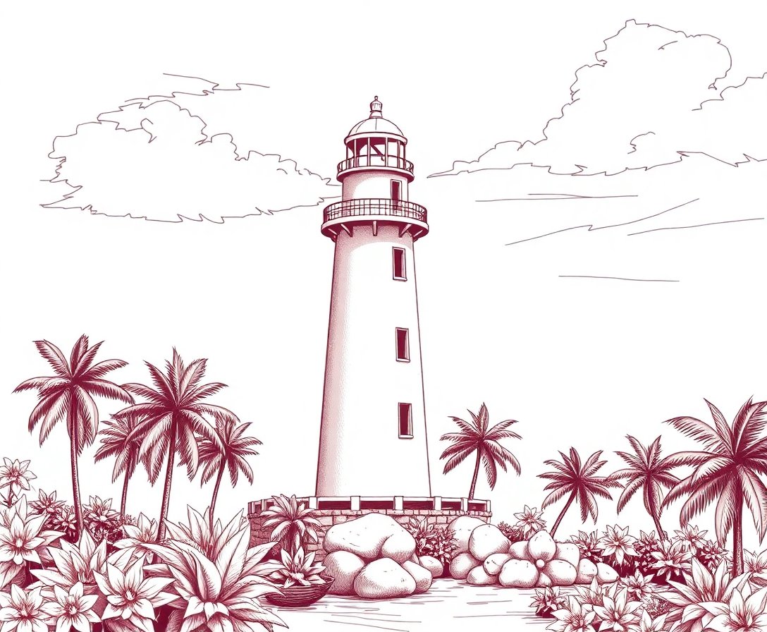 Ultimately, step back and admire your finished coastal masterpiece. The lighthouse stands majestically against tropical surroundings, rendered in beautiful sepia tones that evoke timeless elegance and nautical romance.