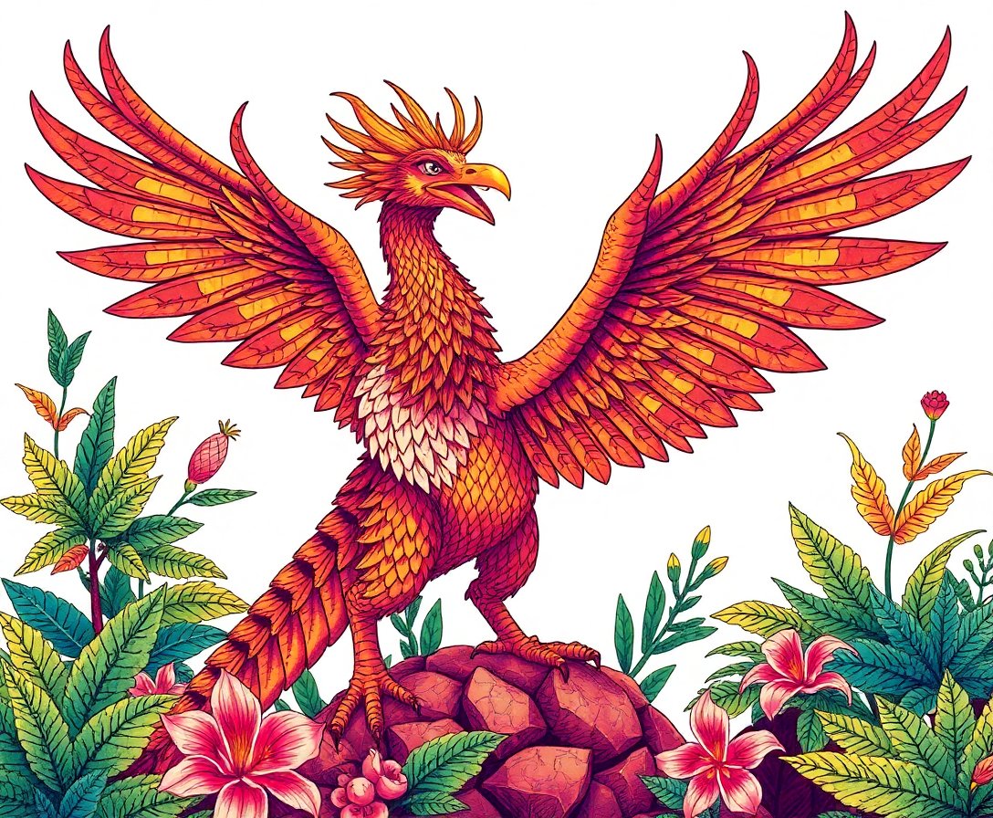 The dramatic contrast between light and shadow creates depth while tropical botanical elements add vibrant color. This unique combination of mythological beasts and vintage aesthetics produces truly captivating artwork.