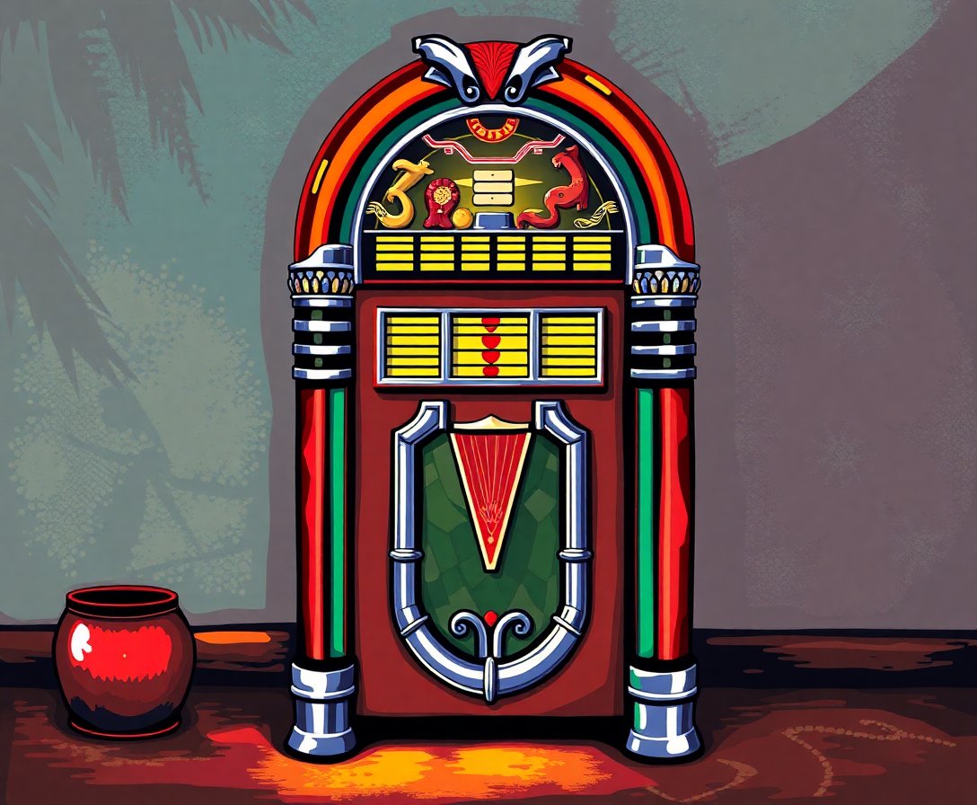 The dramatic shadows and Cuban jukebox styling create authentic retro atmosphere. This classic diner aesthetic brings nostalgic charm to any room while celebrating music culture.