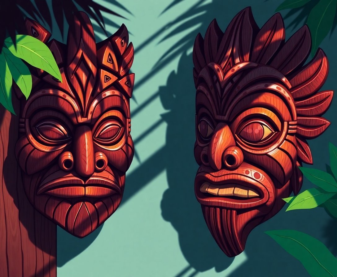 The dramatic chiaroscuro lighting technique creates stunning depth and dimension. The carved mask motifs celebrate authentic Polynesian cultural artistry through vibrant orange and fire tones.