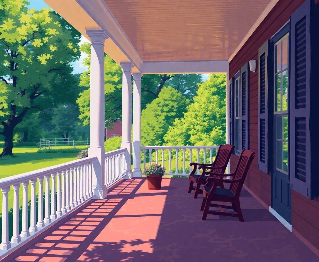 The warm sunset lighting and nostalgic shadows create a timeless vintage atmosphere. This classic impressionist style captures the peaceful essence of evening porch scenes.