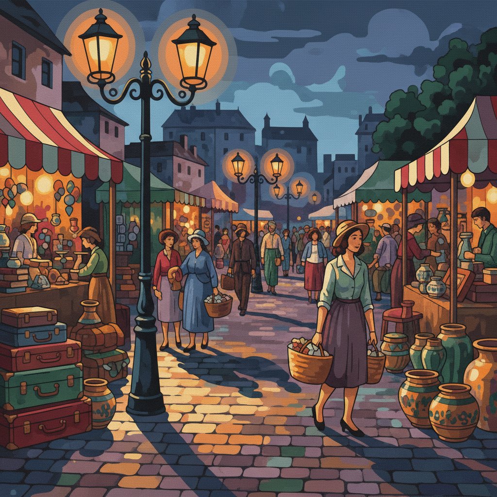 The canvas measures 16×20 inches, perfect for displaying in living rooms, bedrooms, or offices. The vintage marketplace scene creates an impressive focal point in any space.