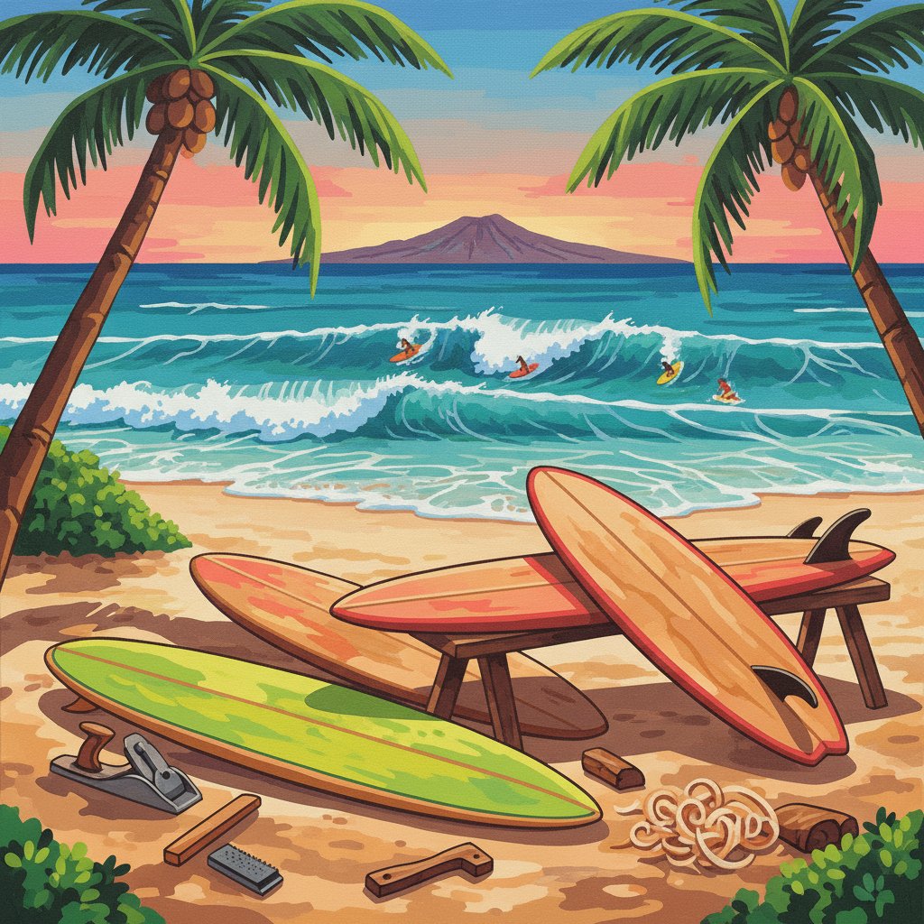 Transform your creative space with this vibrant Shaping Tropical Balsa Boards Paint By Numbers masterpiece. This captivating design brings the sunlit energy of a surfboard craftsman’s workshop directly to your canvas. Each brushstroke reveals the meticulous artistry behind tropical board shaping.