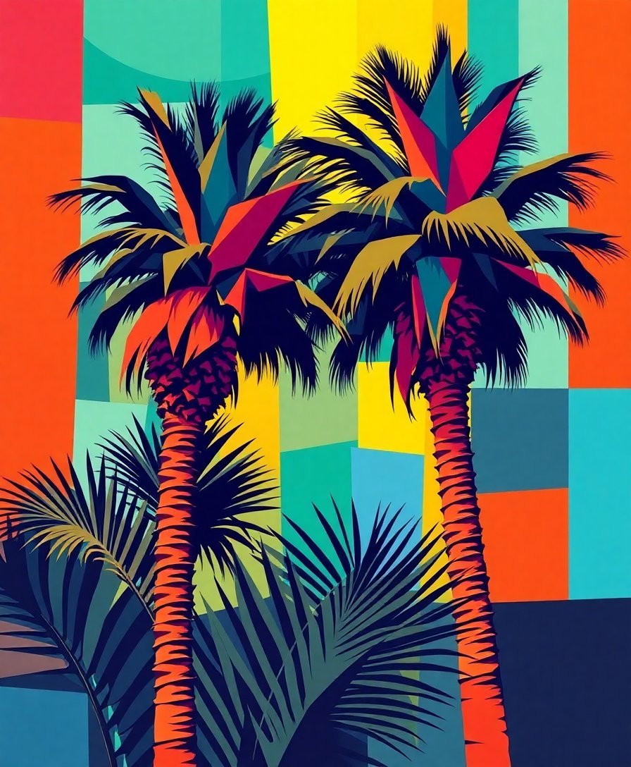 The unique combination of retro cubist style with Florida palm imagery creates a striking contemporary art piece that complements modern home decor perfectly.