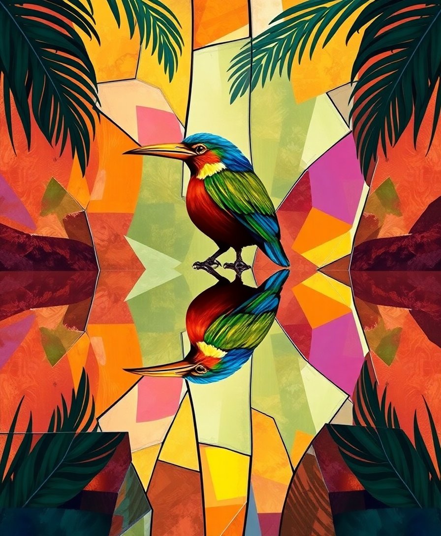 Furthermore, begin with the larger fractured sections to establish the bird’s dramatic silhouette. Additionally, layer the tropical colors systematically, watching the cubist techniques bring depth and dimension to each mirrored fragment.
