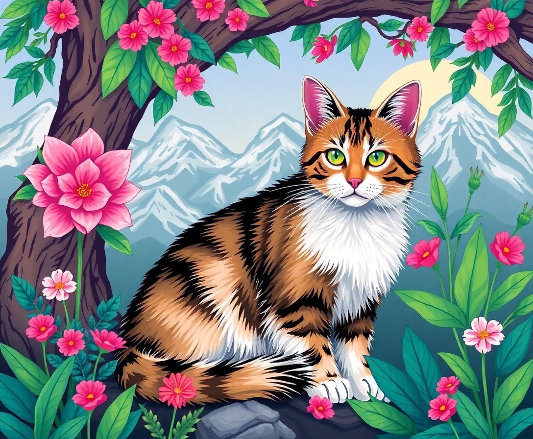 Transform your space with this captivating Sheltered Tropical Alpine Cat Paint By Numbers masterpiece. This unique design blends tropical elements with alpine winter beauty, creating a stunning wildlife portrait. Experience the joy of painting as you bring this sheltered feline scene to life.