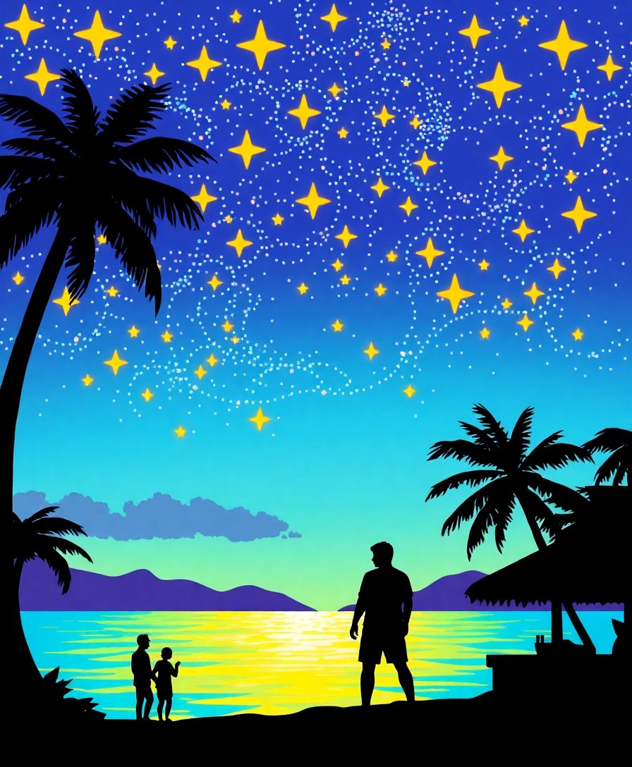 Ultimately, step back and admire your completed masterpiece. The tropical stars and festive silhouettes come alive through your dedication. Additionally, the vintage charm creates a perfect conversation piece. Your finished artwork celebrates both artistic achievement and tropical nighttime magic.
