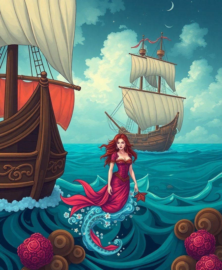 Subsequently, begin with lighter sepia tones to establish the vintage galleon’s weathered appearance. Furthermore, work systematically from larger sections to intricate details. Additionally, this technique builds confidence while revealing the siren’s ethereal beauty.