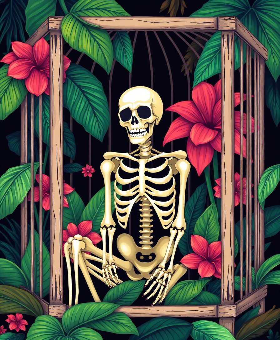 Ultimately, add final touches to enhance the tropical and gothic contrasts. Your completed artwork showcases the perfect blend of bones and birdcage imagery. Display it proudly as a conversation starter.