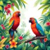 The canvas measures 16×20 inches, providing ample space to showcase the intricate details of tropical birds and their vibrant jungle environment.