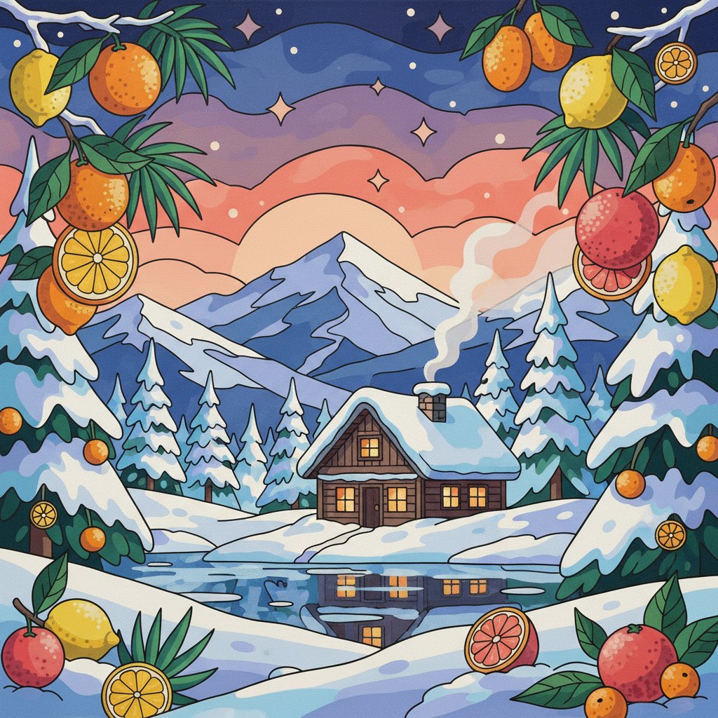 Transform your artistic space with this stunning Snowy Chalet Exotic Citrus Paint By Numbers masterpiece. This captivating design blends winter’s serene beauty with vibrant tropical elements. Moreover, the contrast creates a unique visual experience that delights every painter.