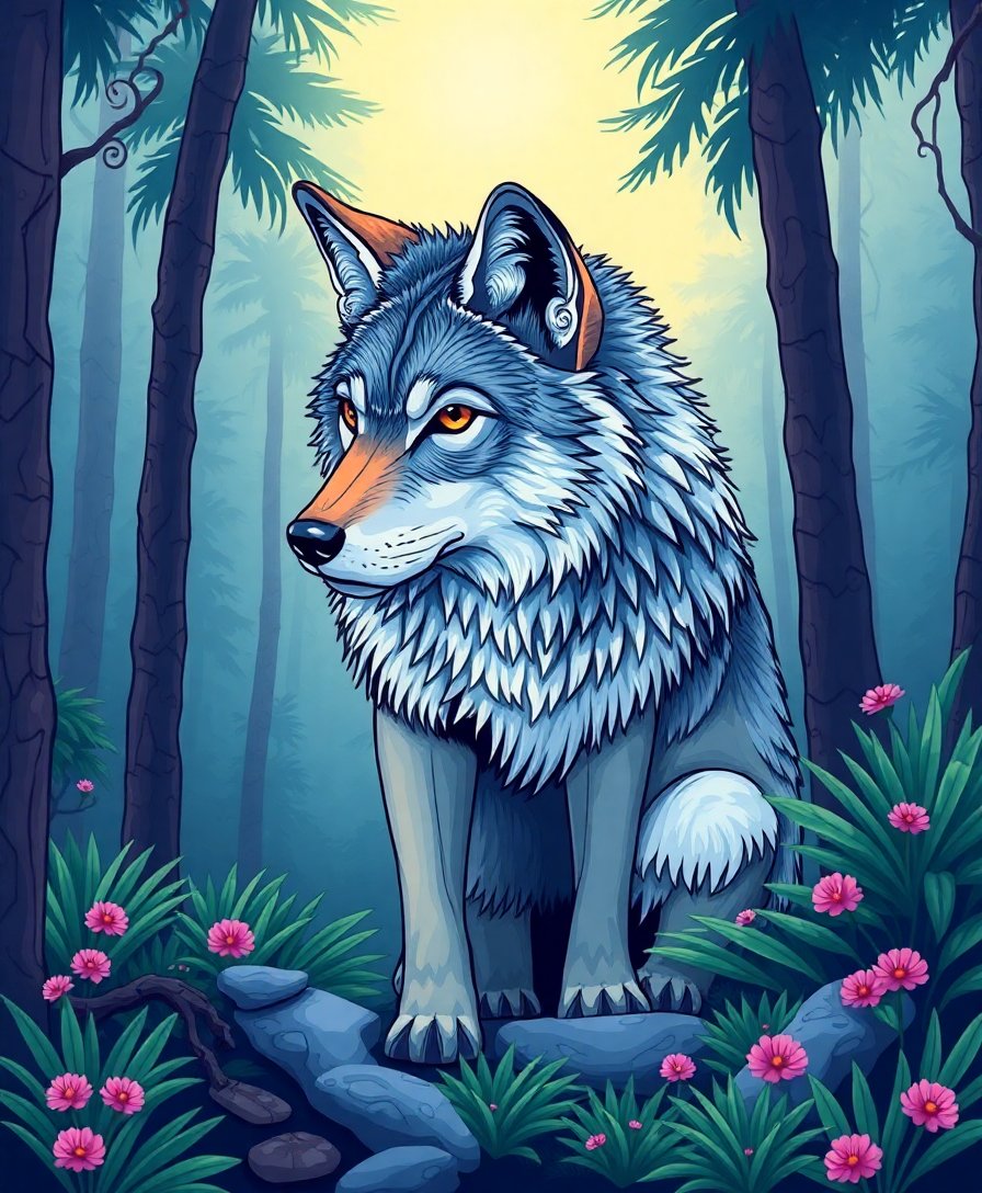 The atmospheric palm trail setting creates a unique tropical wildlife scene. The realistic details and green color palette make this wolf painting stand out from traditional designs.