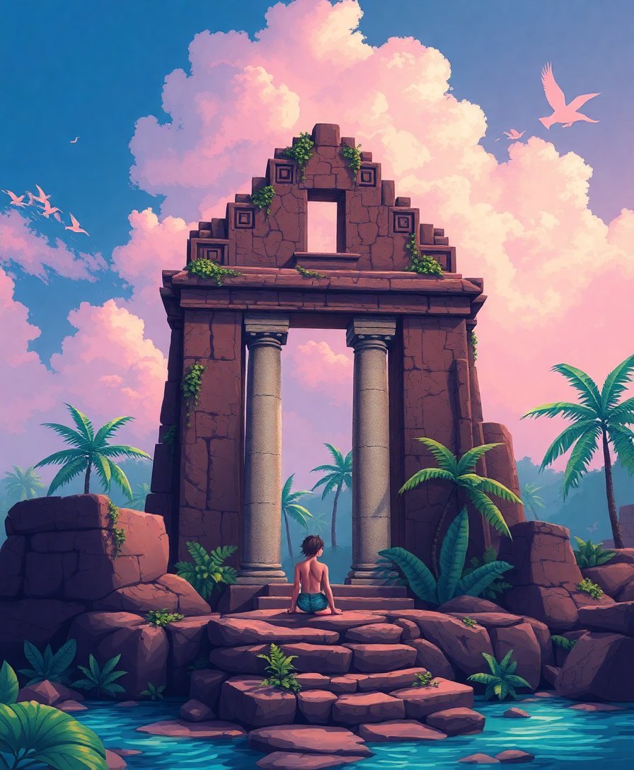 Ultimately, step back and admire your completed underwater masterpiece. The solitary figure among fluted columns creates a hauntingly beautiful focal point. Your finished artwork captures the mysterious essence of lost civilizations.