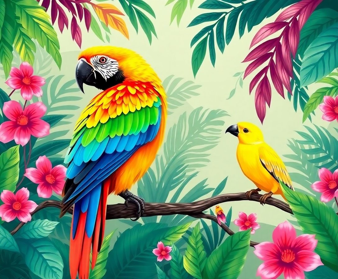 The realistic detail captures the mystical beauty of a solstice night with lush tropical birds and foliage. The color palette creates depth and atmosphere perfect for holiday decoration.