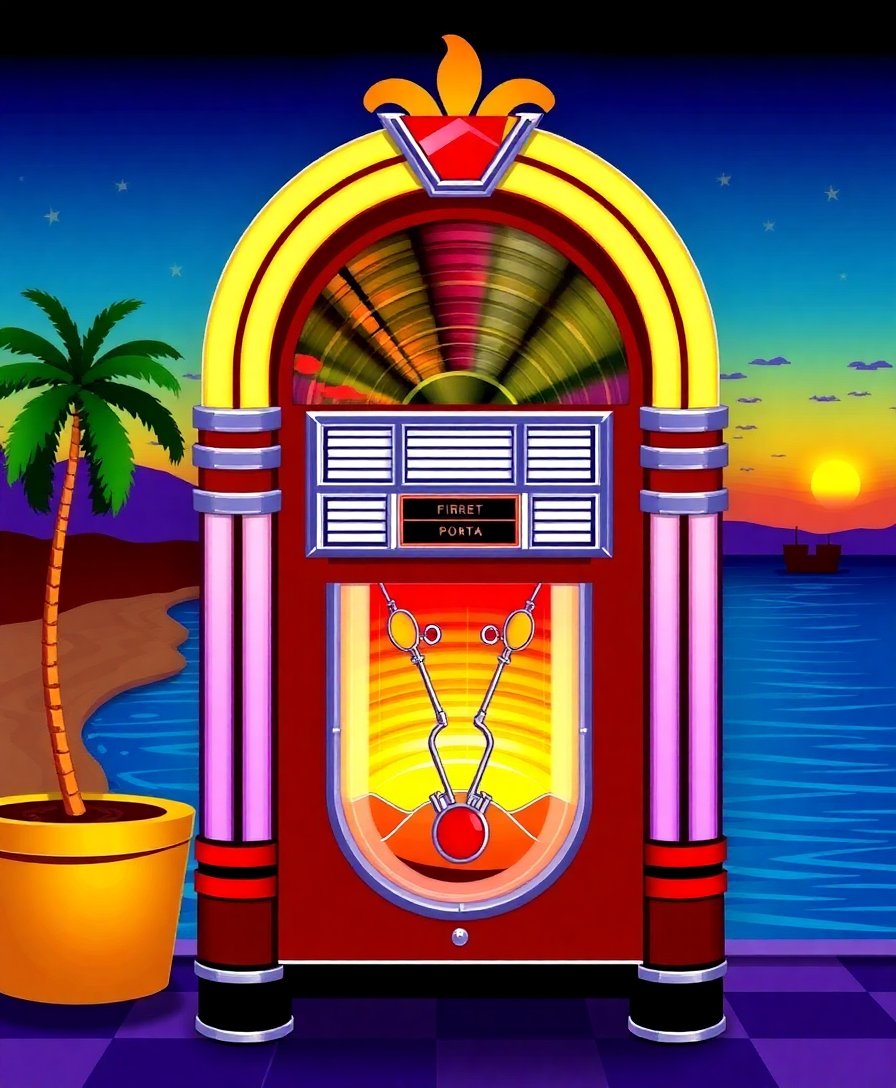 Transform your creative space with this captivating Spinning Sunset Island Records Paint By Numbers masterpiece. This remarkable kit combines the nostalgic charm of classic diner jukeboxes with tropical island vibes. Moreover, the warm palette creates an enchanting sunset scene that celebrates music culture.
