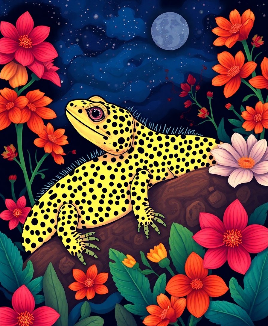 Ultimately, add final highlights to bring your spotted reptile to life among the exotic flora. Step back frequently to admire your progress. Your finished artwork captures the mysterious beauty of desert wildlife at night.