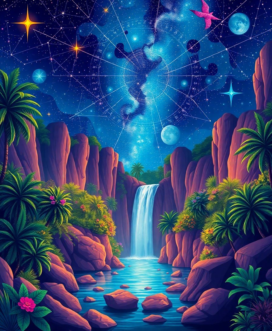 Transform your creative space with the mesmerizing Starlit Tropical Aquarius Falls Paint By Numbers. This enchanting design blends celestial beauty with tropical paradise elements. Moreover, each brushstroke brings mystical waterfalls and starlit skies to life on your canvas.