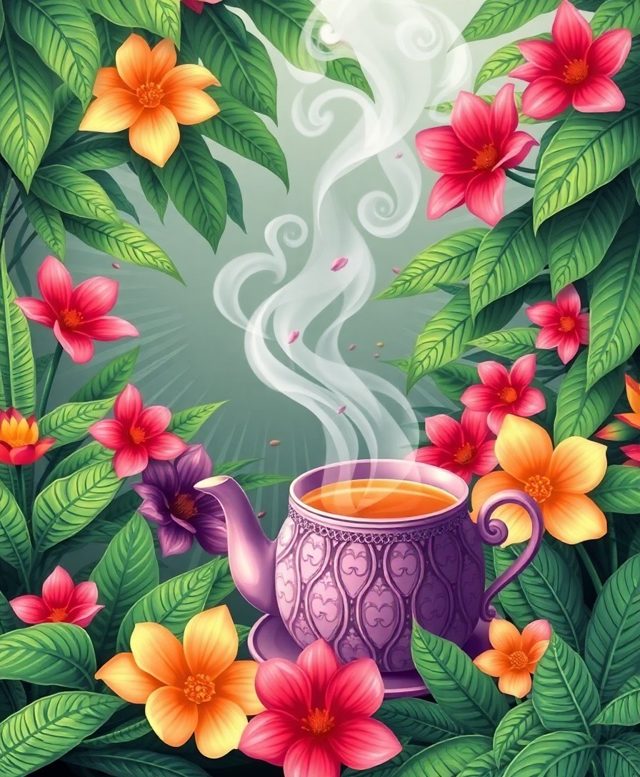 Ultimately, step back and admire your finished tropical tea scene. The warm steam and botanical elements create a cozy atmosphere perfect for any room.