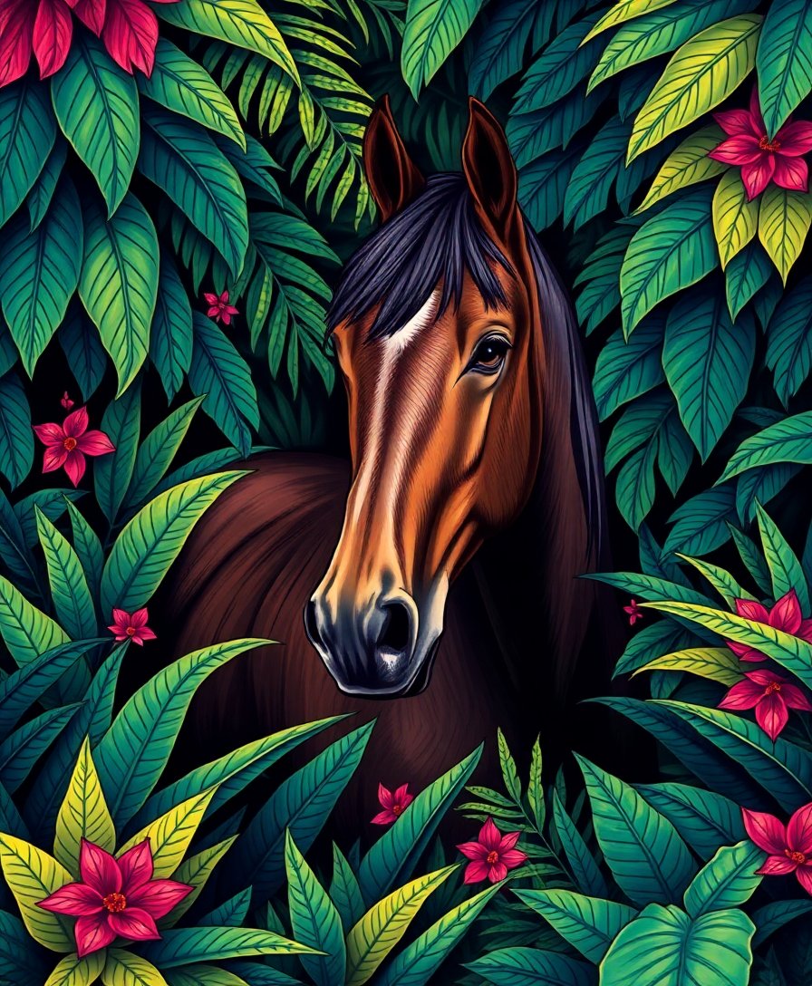 Ultimately, add final touches to enhance the tropical atmosphere surrounding your noble steed. Blend colors gently where sections meet. Your completed painting radiates the serene beauty of equestrian art within a lush greenhouse setting.