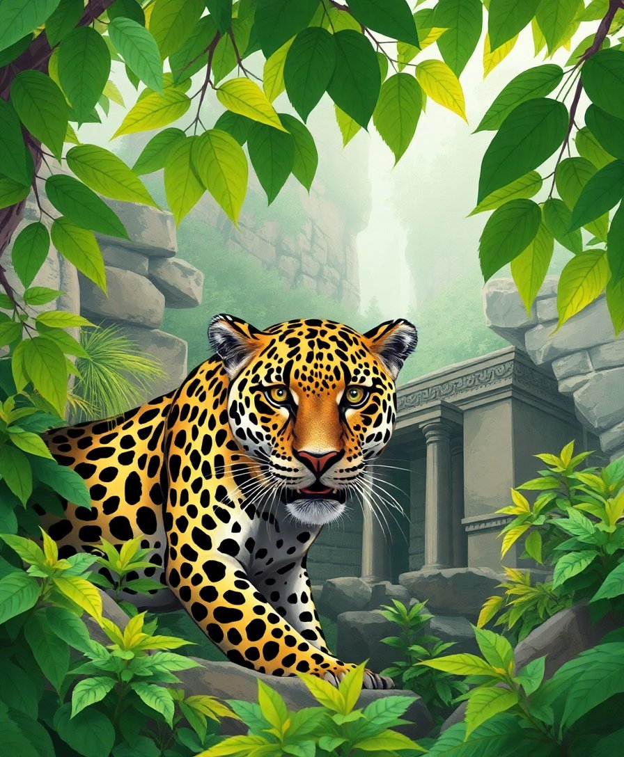 Ultimately, step back and admire your completed vintage masterpiece. The weathered stone jaguar emerges beautifully against the tropical backdrop. Your finished artwork captures the mysterious allure of forgotten civilizations reclaimed by nature.