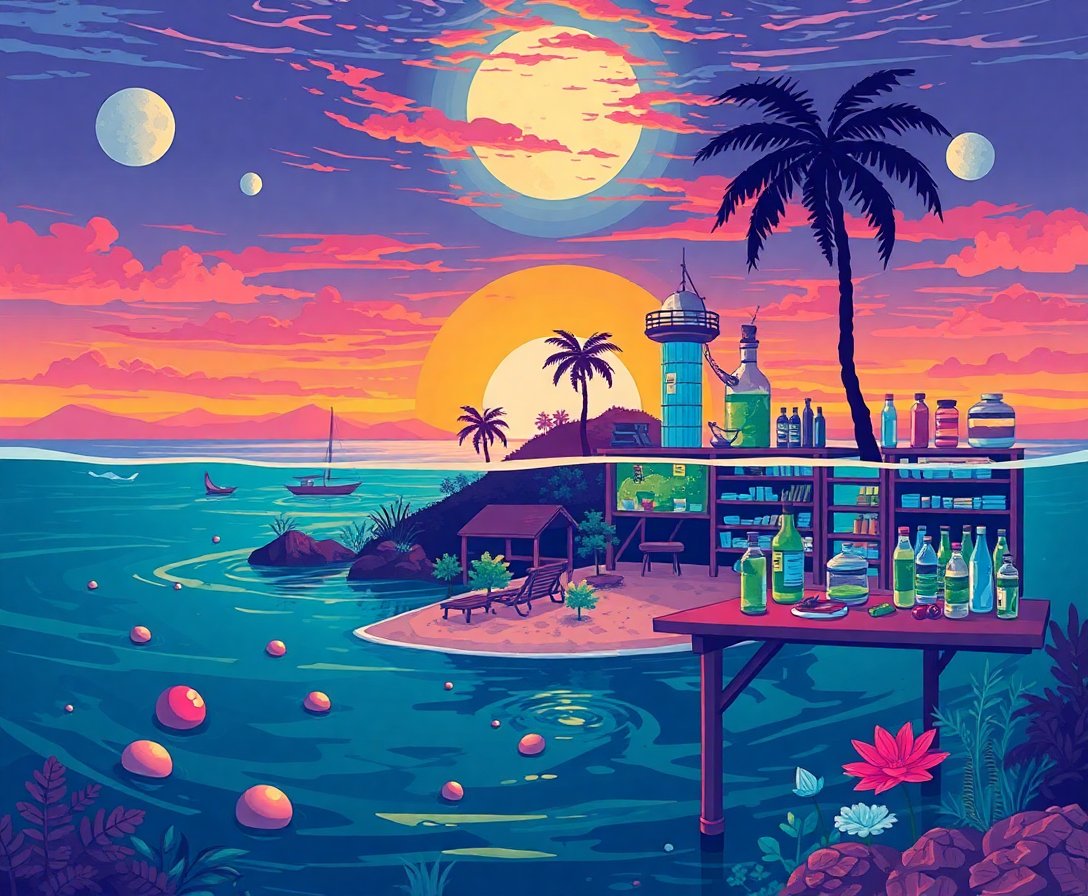 This unique design captures the nostalgic charm of mid-century scientific imagination with realistic underwater laboratory details and exotic tropical elements.