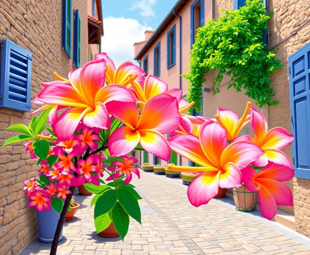 Ultimately, step back and admire your completed European masterpiece. The vibrant frangipani blooms against ancient masonry create a captivating focal point. Your artistic achievement deserves prominent display in any room.