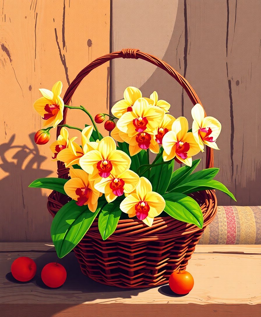 Finally, add finishing touches with your small brush for intricate details. Ultimately, you’ll witness your masterpiece come alive with vibrant orchids and weathered basket textures that capture autumn’s warm embrace.