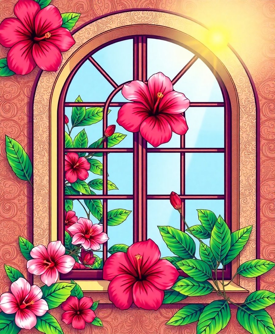 Ultimately, add final touches to enhance the sunbathed warmth radiating through your vintage window scene. Furthermore, step back to admire how tropical hibiscus blooms come alive against the antique glass backdrop.