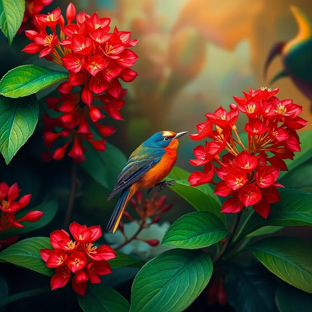 Ultimately, step back and admire your completed masterpiece as vibrant sunbirds emerge among brilliant red ginger blooms. Your finished artwork transforms any room into a tropical paradise filled with natural beauty.