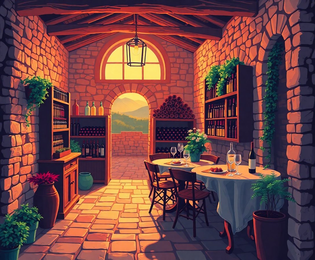 Ultimately, add the finishing touches to complete your masterpiece. The vintage aesthetics shine through as golden light dances across wine barrels and aged stone walls.