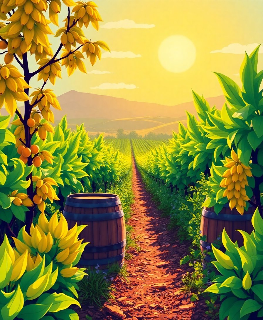 Transform your space with the captivating Sunlit Banana Frond Casks Paint By Numbers. This tropical landscape masterpiece combines realistic oak casks nestled beneath vibrant banana leaves bathed in golden sunlight. Each brushstroke brings this serene vineyard scene to life.