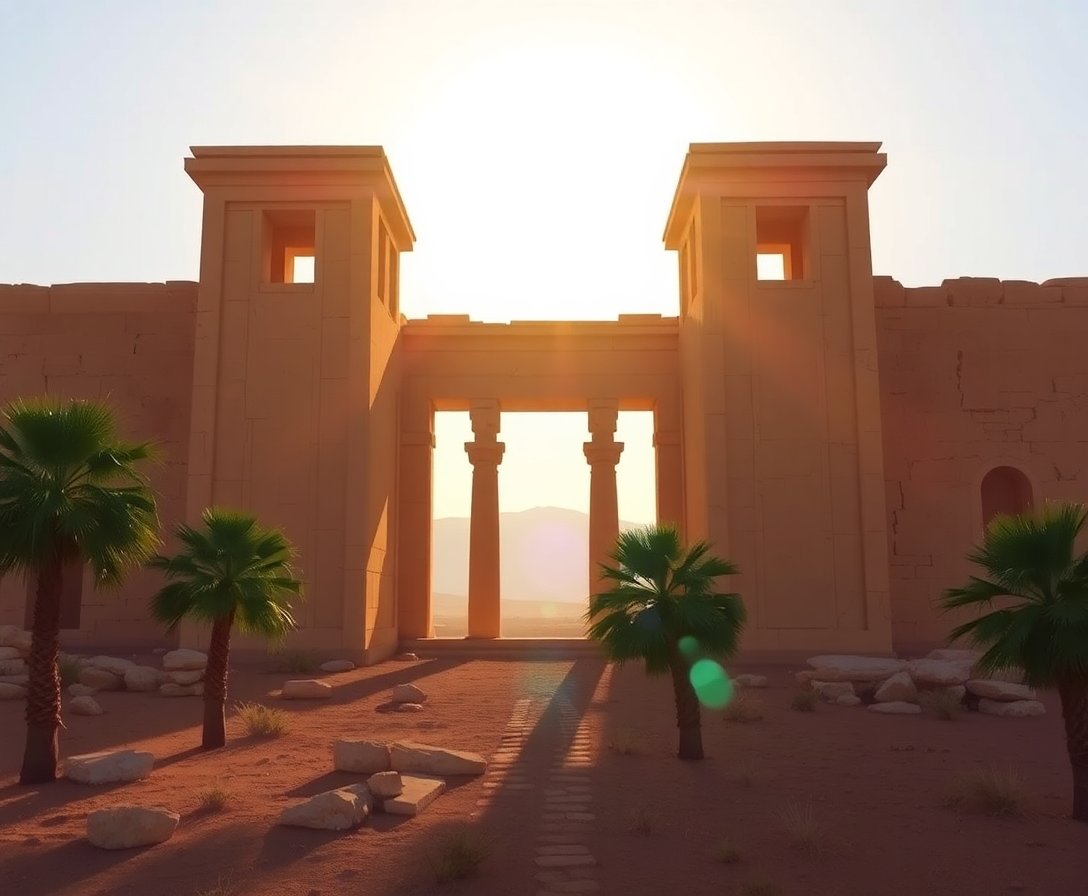 The combination of ancient archaeological elements with golden desert sunlight creates a uniquely captivating scene. The realistic detail and warm palette make this perfect for anyone interested in history or exotic landscapes.