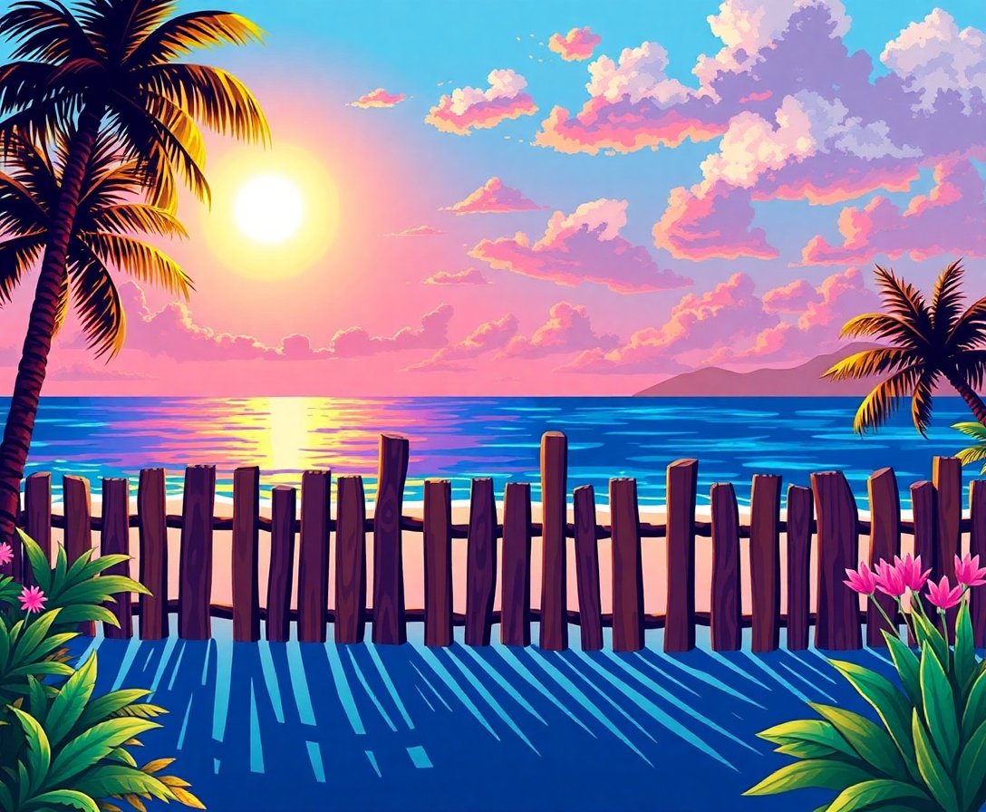 Transform your space with the serene beauty of tropical countryside through this captivating Sunlit Island Fence Post Paint By Numbers kit. This stunning design captures the essence of rustic island life, featuring weathered fence posts bathed in golden sunbeams against a backdrop of lush pastoral scenery.