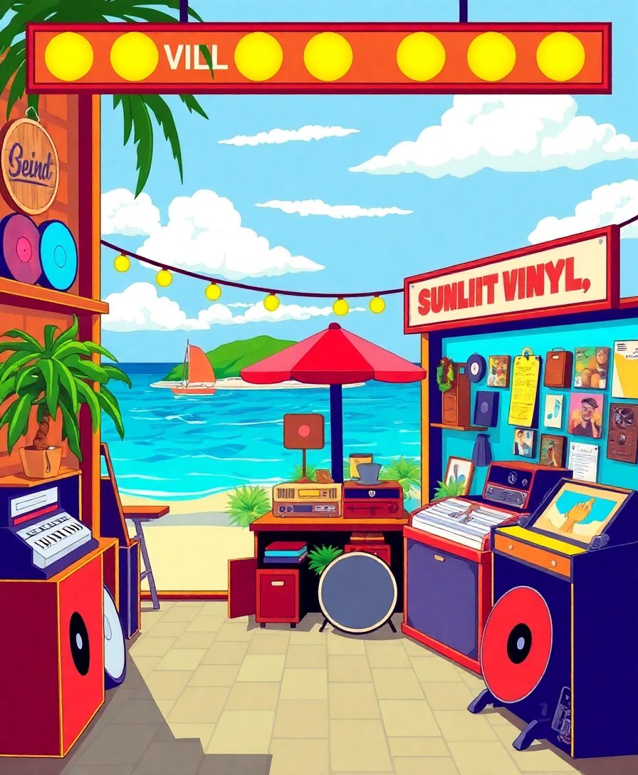 Ultimately, step back and admire your completed island music sanctuary. The sunlit atmosphere radiates warmth while vintage elements create nostalgic appeal. Your artistic achievement deserves prominent display in any room.