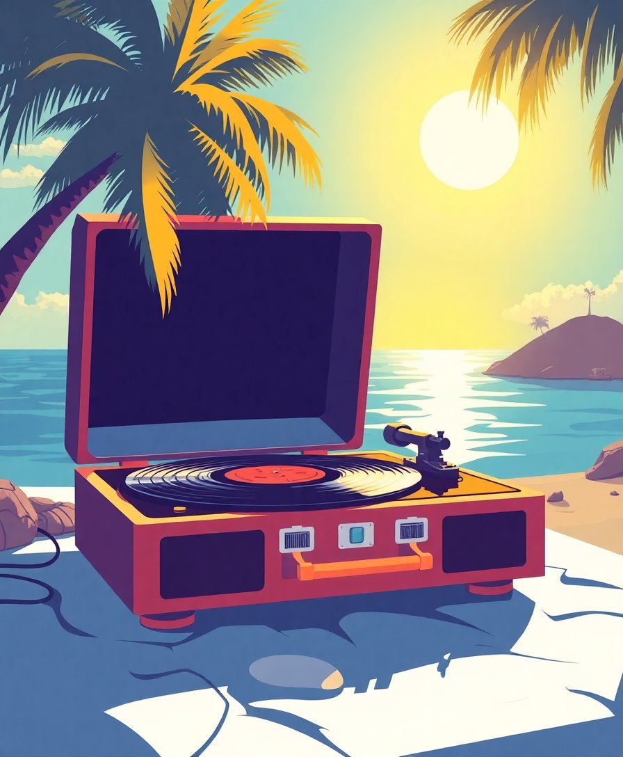 The golden hour lighting and beachfront setting create a unique vintage vinyl atmosphere. The realistic ocean backdrop perfectly complements the record player theme for stunning visual impact.