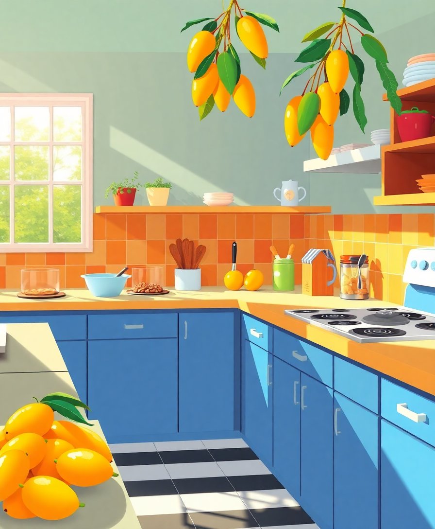 Transform your creative space with the Sunlit Midcentury Kitchen Mangoes Paint By Numbers kit. This nostalgic masterpiece captures the warm essence of a retro kitchen bathed in golden sunlight. Furthermore, the tropical mangoes add vibrant charm to this realistic culinary scene. Additionally, you’ll create a stunning artwork that celebrates both vintage aesthetics and tropical beauty.
