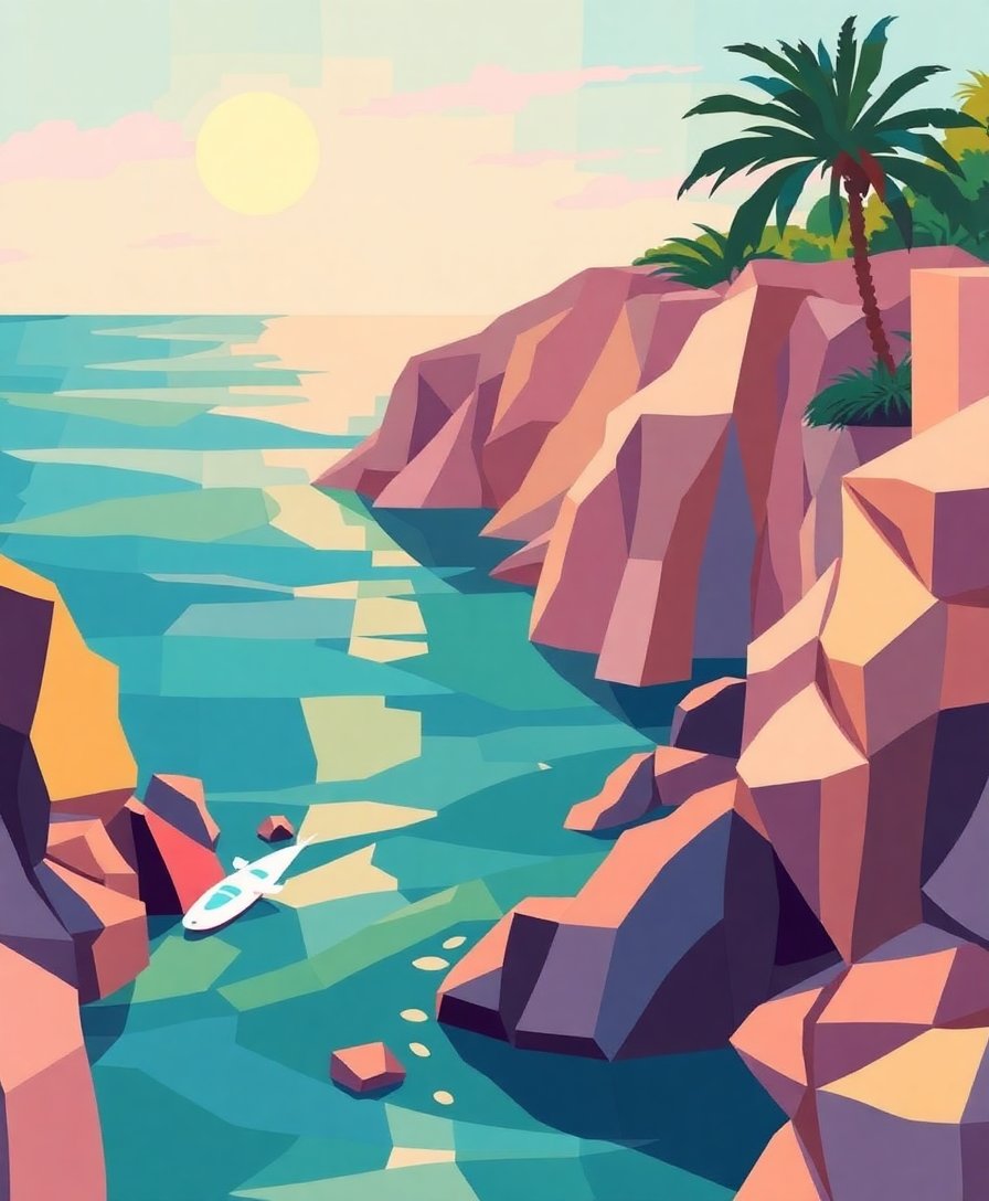 Ultimately, step back and admire your finished geometric coastline masterpiece. Additionally, the soft pastels and bold angles create stunning visual harmony. Your artistic achievement deserves prominent display.
