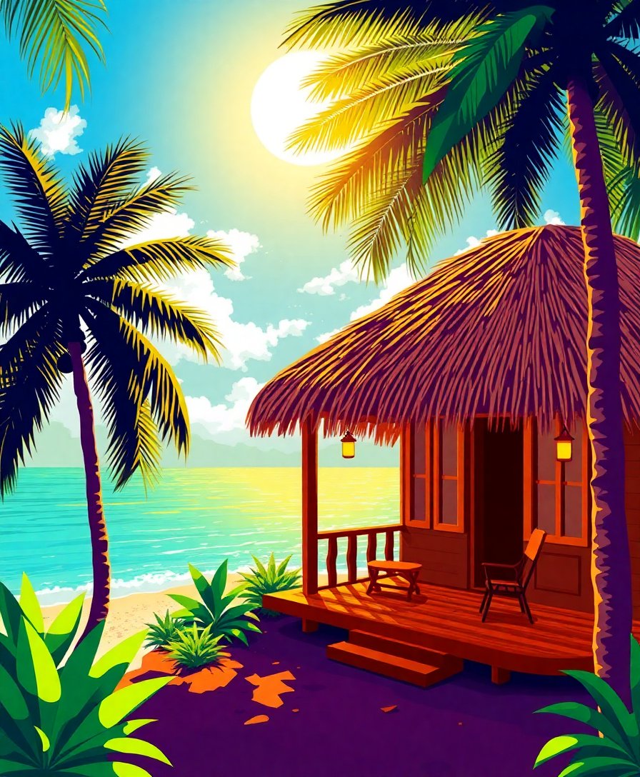 The realistic thatched textures and warm sunlight create an authentic tropical atmosphere. The detailed bamboo elements and cozy indoor feeling make this piece truly captivating.