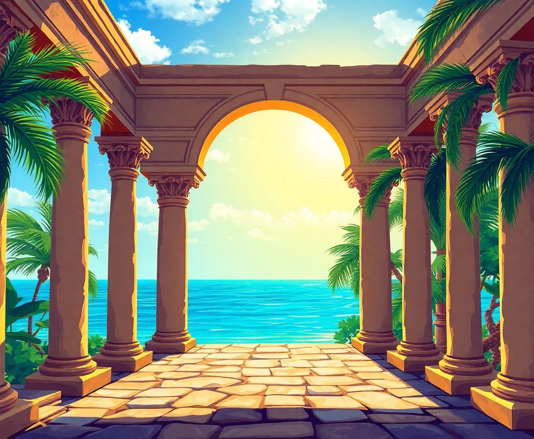 Embark on this extraordinary artistic voyage where ancient mystery meets tropical paradise. Therefore, discover the joy of creating your own Sunlit Tropical Atlantis Colonnade paint by numbers masterpiece today.
