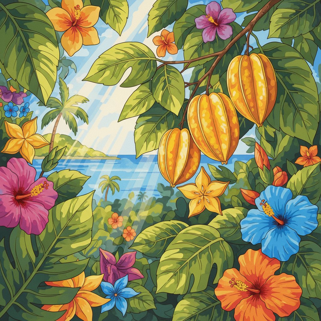 Ultimately, step back and admire your finished tropical carambola masterpiece. Meanwhile, the sunlit exotic fruit radiates warmth and vibrancy. Consequently, your completed artwork becomes a stunning conversation piece.