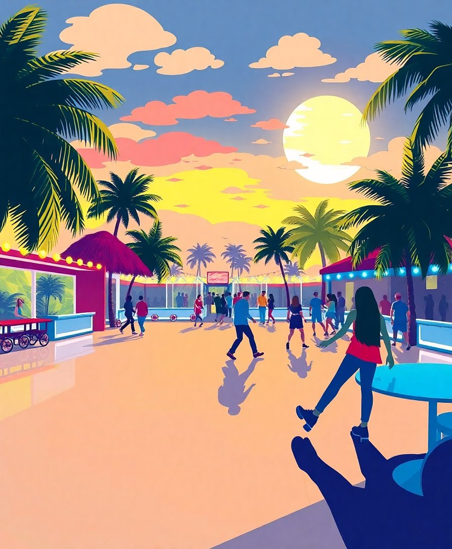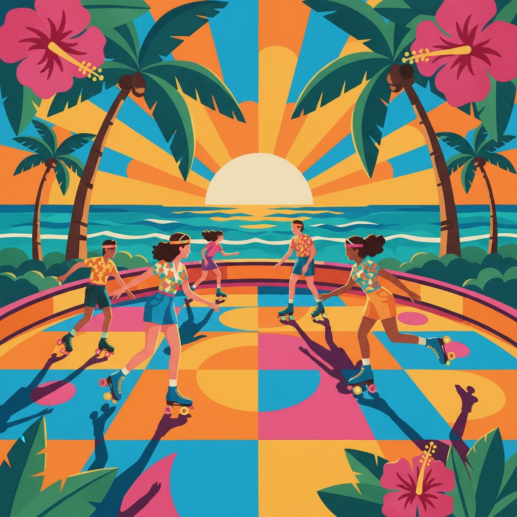 Ultimately, step back and admire your finished tropical roller disco scene. Furthermore, allow paint to dry completely before handling. Additionally, your sunset techniques will create stunning warm lighting effects throughout the artwork.