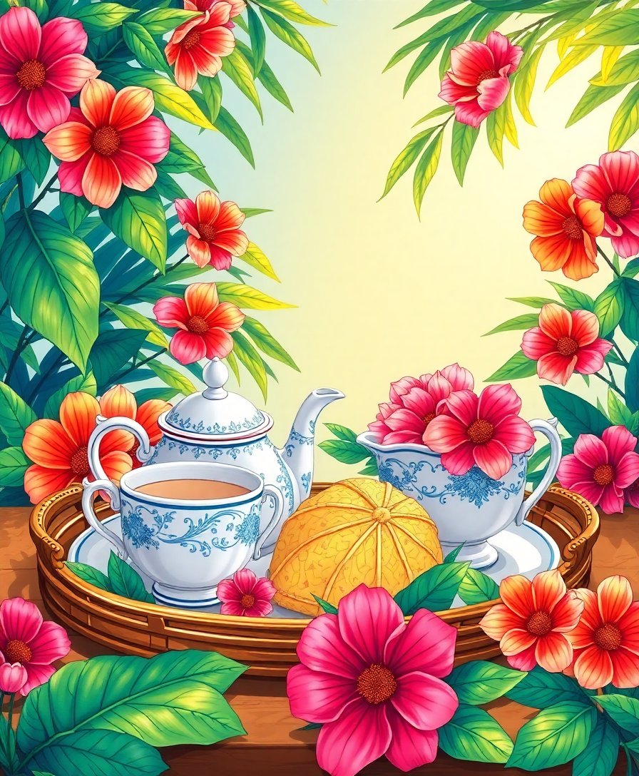 This botanical tea time scene offers remarkable stress relief benefits. Additionally, painting promotes mindfulness and mental clarity. Furthermore, the warm greens and tropical elements create a cozy indoors atmosphere. Moreover, art therapy research shows significant wellness improvements through creative activities.